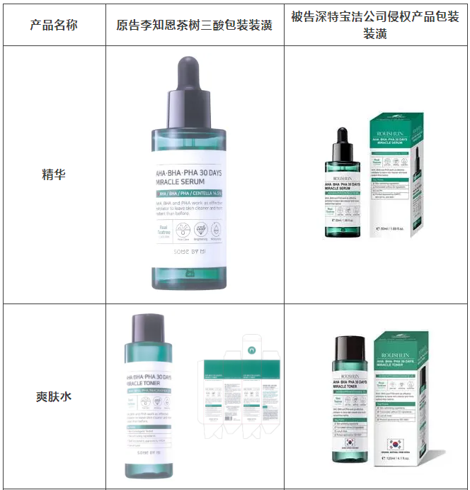 2021年原告委托五星体育调查发现,被告汕头市深特宝洁实业有限公司生产、销售和推广的“茶树祛痘美白补水液”“茶树香皂”等护肤品,其产品包装装潢直接抄袭、摹仿原告前述已经具有较高知名度和影响力的“SOME BY MI/莎柏蜜”茶树三酸系列化妆品和黑蜗牛精华液的包装、装潢设计,使用与之近似的标识,造成消费者混淆误认。故原告作为茶树三酸、黑蜗牛精华包装装潢权益获益人,诉至广东省汕头市中级人民法院。汕头中院认定:李知恩主张的茶树三酸、黑蜗牛精华包装装潢构成具有一定影响的包装装潢,深特宝洁公司生产、销售茶树三酸、黑蜗牛精华液的行为构成不正当竞争。因判赔额不符合原告预期,原告后上诉至广东省高级人民法院,广东省高级人民法院最终维持一审判决。